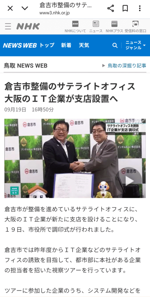 2025年9月19日 倉吉サテライトオフィス進出協定式(第1号)の調印式を実施して頂きました。
